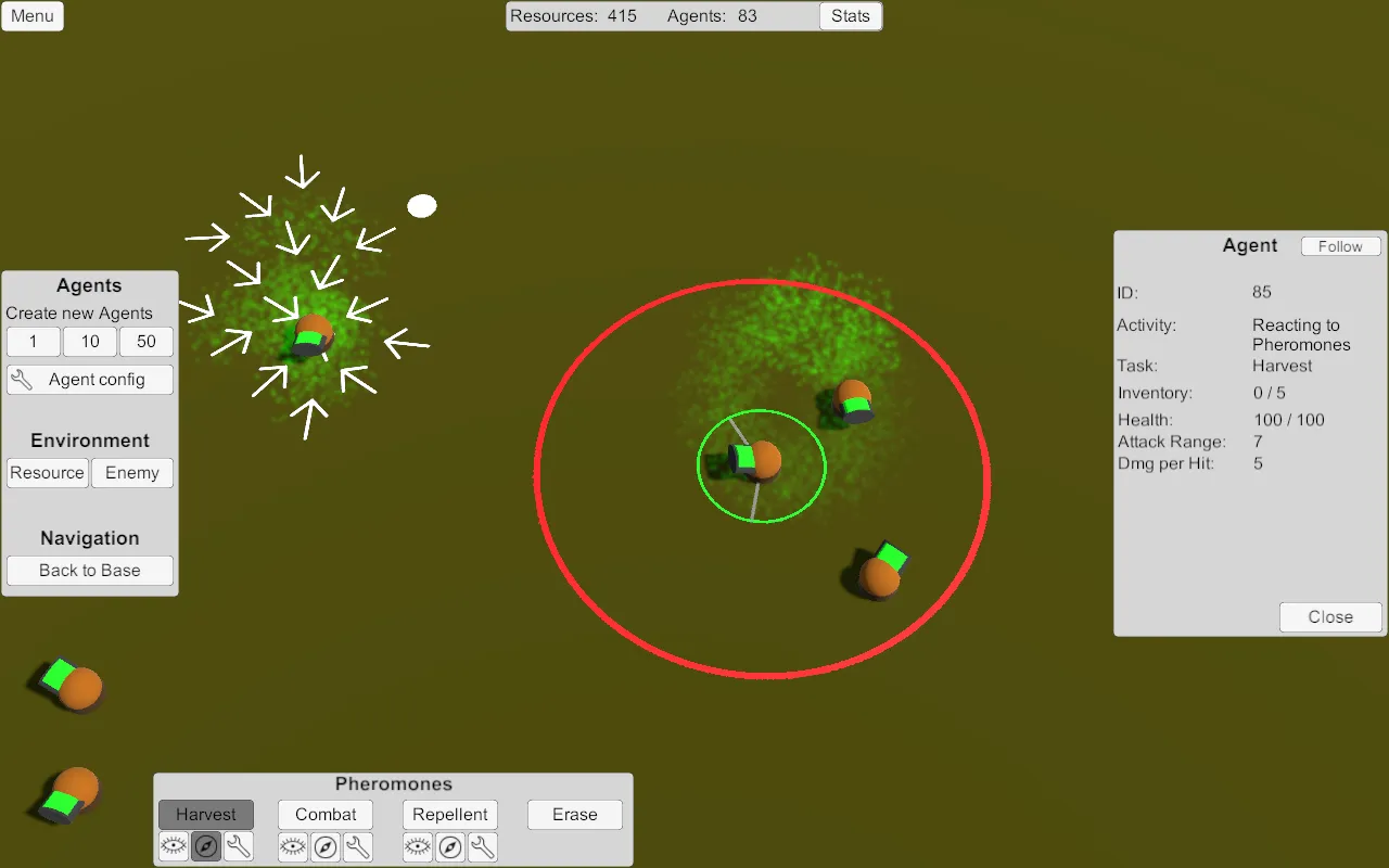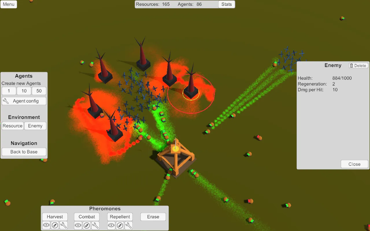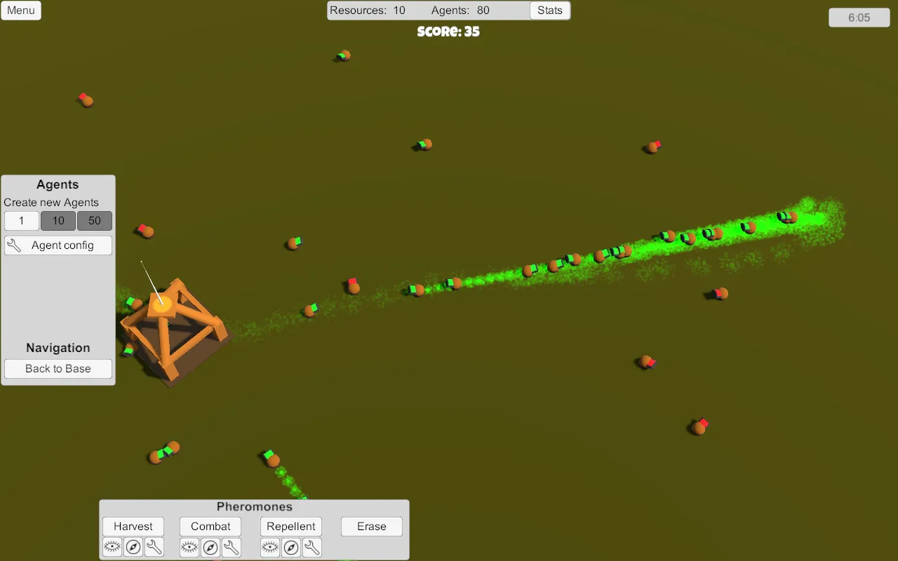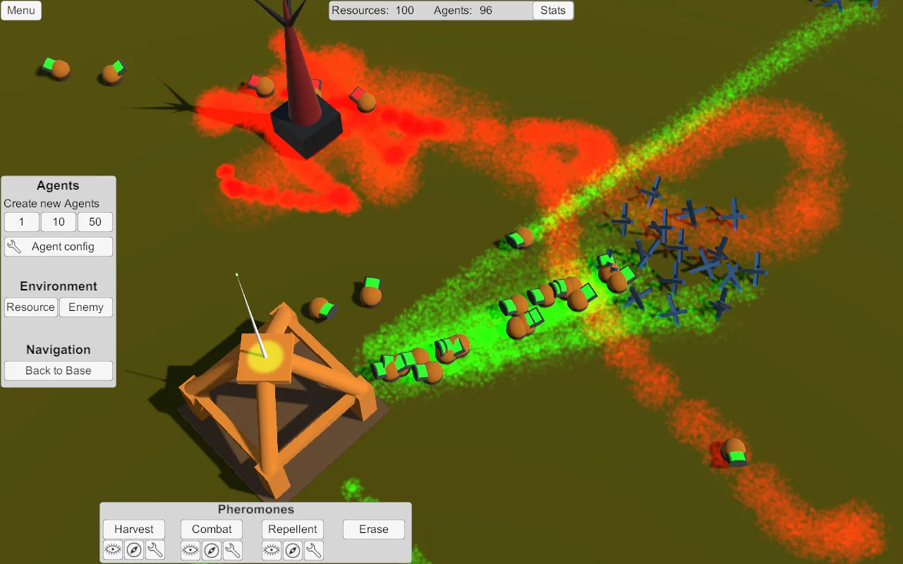 A serious real-time strategy game to teach users about pheromone-based systems. The player is in charge of a colony of ant-like agents and has to help them to collect resources and fight enemies.